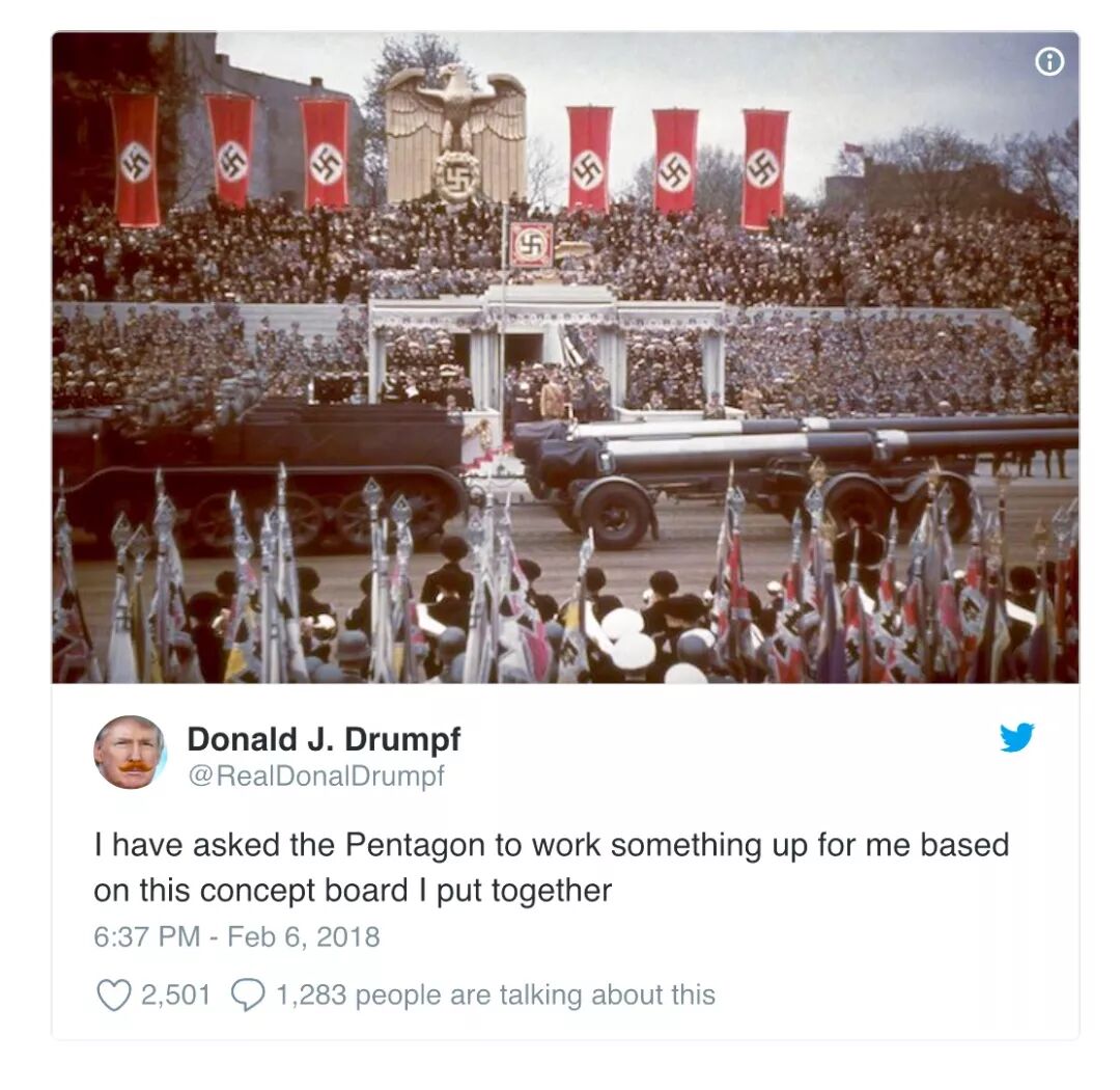 “总统:‘我已经跟五角大楼说了,大游行的方案就按我的设计走!(纳粹阅兵仪式)’”
