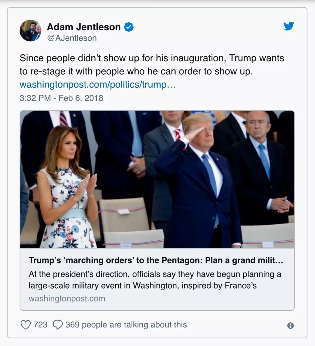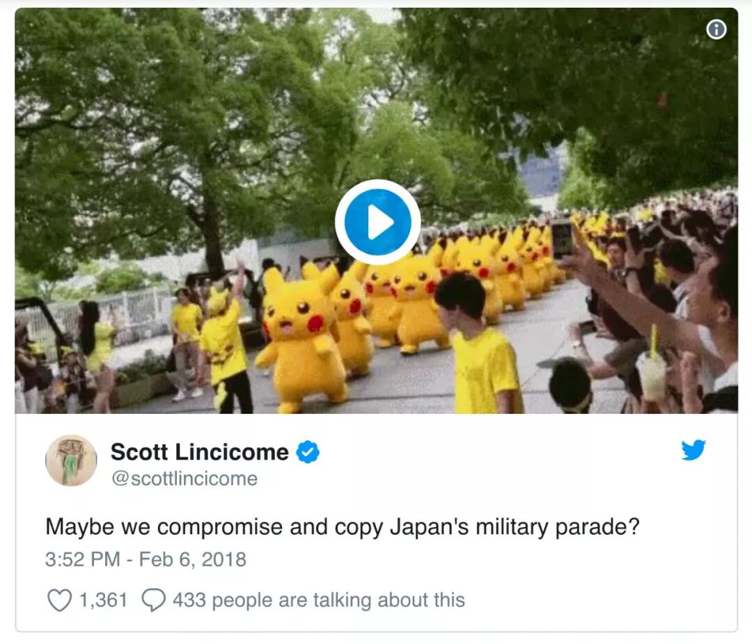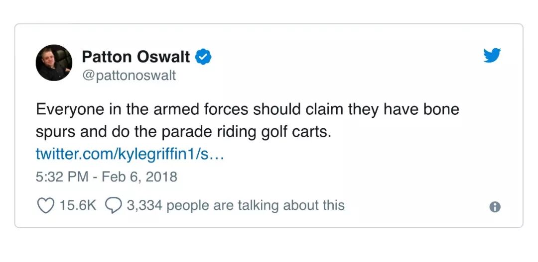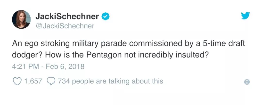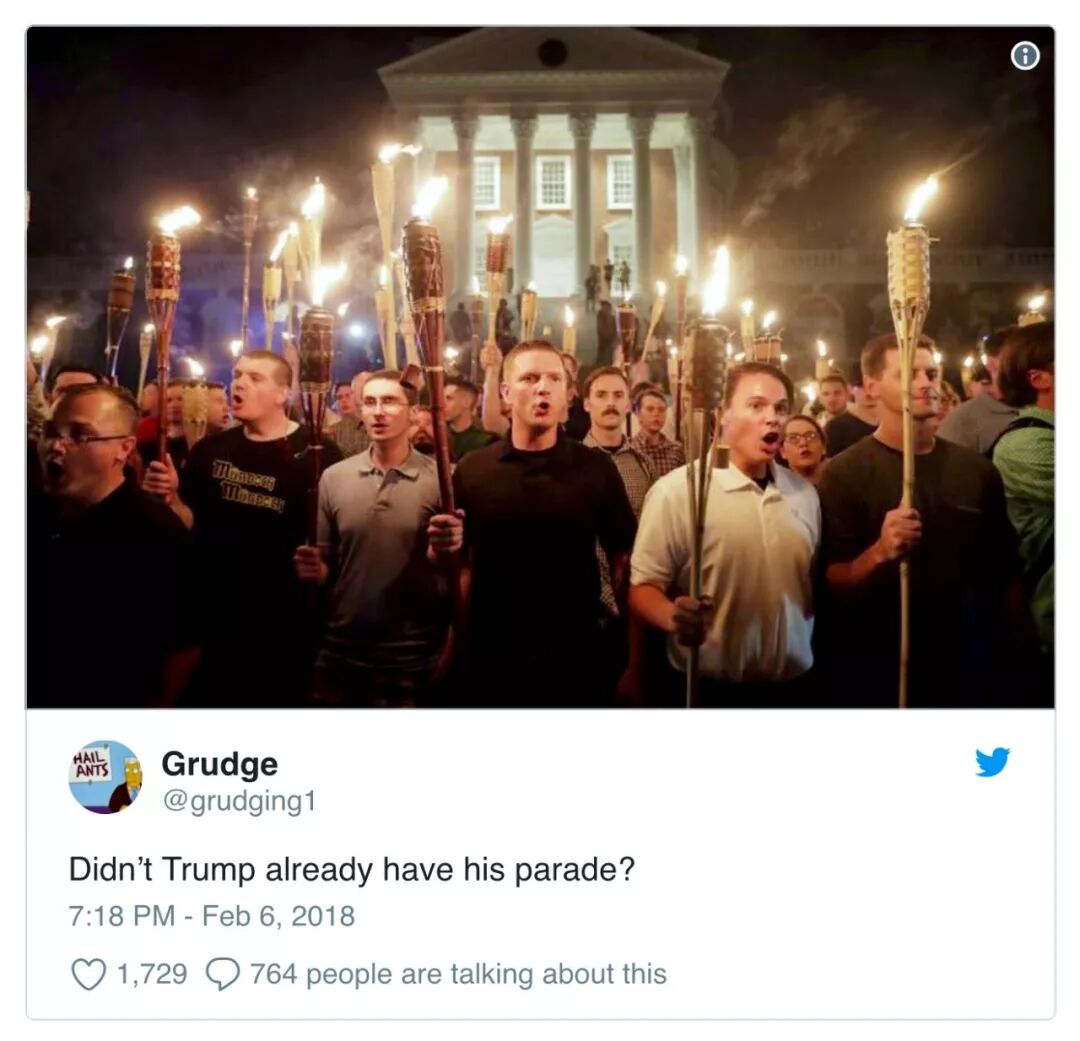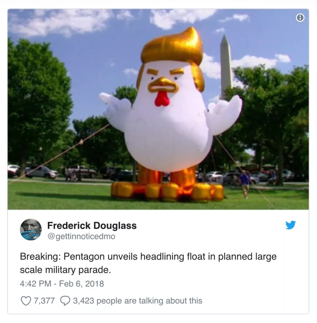 近日,白宫证实了川普总统命令五角大楼准备在华盛顿举行“法式大阅兵”的消息,目前军方高层正在研究执行这一命令的各项细节。得到这个消息,作为互联网段子手的扛把子,美国网民们再也闲不住了,在推特上又开始了各种不留情面地怼总统,例如以下这样的:
