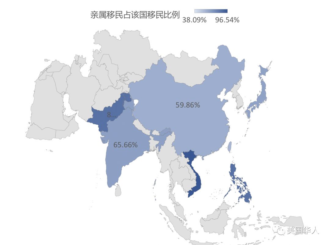 亚裔亲属团聚移民占移民来源的大头。家庭移民占该来源国移民总数的比例,2016年。数据来源:美国国土安全部。