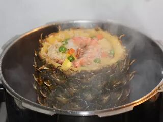 4. 最后一道工序蒸能让整个炒饭变柔软温润,且更入菠萝的香甜之味,不可省略。