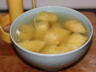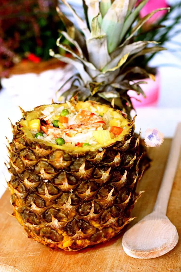 菠萝说起来也不是东南亚专利。最早,还是十七世纪,欧洲探险家在美洲的巴西发现的一种热带水果,英文名叫 “pineapple”。生菠萝含丰富的锰元素和维生素C,按美式标准的一份食用量计算,其锰含量已达到人一天所需量的76%,维生素C含量更高达人一天所需的131%。此外,我们知道的一个常识是,吃菠萝前,要用盐水泡菠萝果肉才好食用,否则舌头会有刺痛感。这个原因的解密,就在于,绝大部分菠萝都含有一种蛋白水解酶(酶,通俗说来,就是一种具有活性的蛋白),叫做bromelain(菠萝酶)。只有用盐水泡过,让这个酶失活,它才不会在食用后破坏舌头等口腔器官的细胞,造成疼痛感。而我们做菠萝饭的时候,高温的炒和蒸也会让菠萝酶失活,因此用来炒菜的菠萝,可以省去泡盐水这一步。