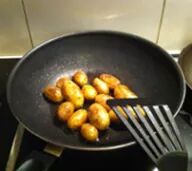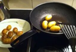 3. 油烧热,中火倒入小土豆,煸炒至小土豆两面金黄。这里分批煎的,个头小的一拨,个头大的一拨分两批。感觉这样容易受热均匀煎得漂亮点。之后用硬木锅铲把小土豆压扁(也可以在步骤2做)。别太用力。