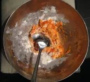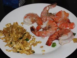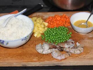 炒各种配料:油锅下植物油20-30ml,放8g盐,加小姜块、葱段、和蒜片(比例 6g:4g:3g), 油热后,大火爆炒虾20-30秒,盛出。余油下鸡蛋,大火炒至金黄,盛出(图8);余油下青豆,大火炒5秒后,下胡萝卜炒20秒,关火,下波罗丁混合均匀,盛出(图9);