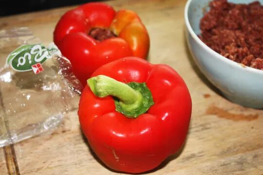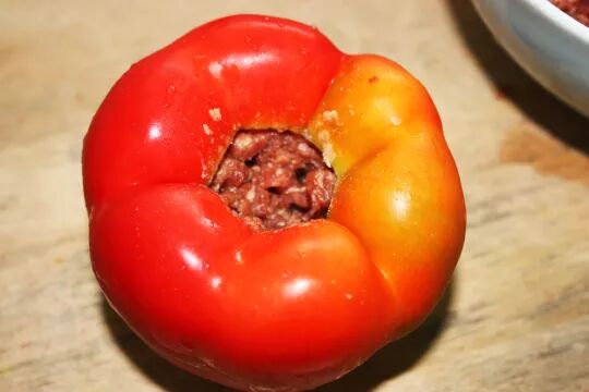 色泽最重要。沿辣椒蒂小心往内压压,与椒肉分离,打开红椒,里面辣椒籽等根据口味选择去留,将肉一点点塞入,一道实诚的好菜,准备就绪。