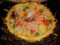 菠萝一个,米饭300-400g,胡萝卜40g,青豆40g,菠萝肉40g,鸡蛋1-2个,虾5-6只