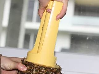 准备菠萝粒:菠萝洗净外表(图1),离顶1/4处切开(图2),用神器将菠萝挖空(图3-5),将靠近中心部分的果肉切块准备做炒饭用。剩余果肉用盐水泡30分钟(图6),洗净盐水直接食用;