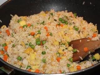 炒米饭:热锅下20ml油,加300-400g米饭,中火翻炒3-5分钟,可以适量加水防止粘锅底,最后加10ml生抽,5g盐,5g鸡精或者鱼精(图10)。关火,把蔬菜和菠萝丁加进去,拌匀(图11)。将混合的米饭用勺装入前面掏空的菠萝里(图11);