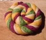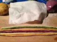 饧发完毕,取各色面团各12-15g(也就是100g面团的1/8)搓成长条,随机组合,之后两端各朝反方向平推,像拧麻花一样把面条团搓成有很多螺旋的条,然后一边开始打圈收拢,成棒棒糖状。