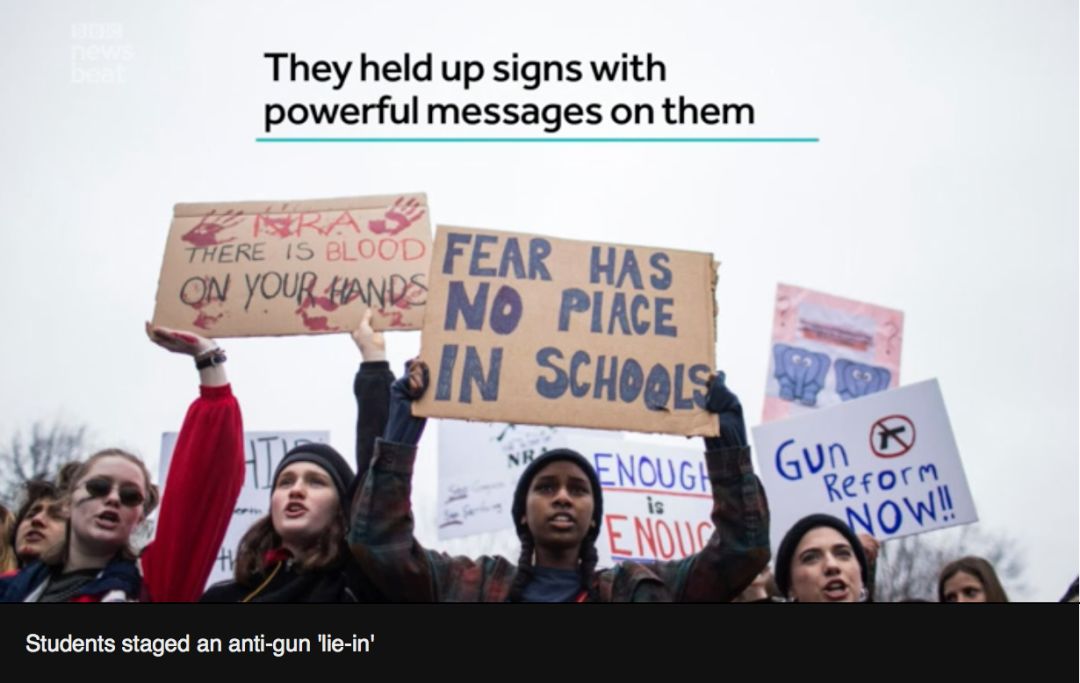 Marjory Stoneman Douglas高中学生抗议政府对控枪的不作为。(BBC截屏)