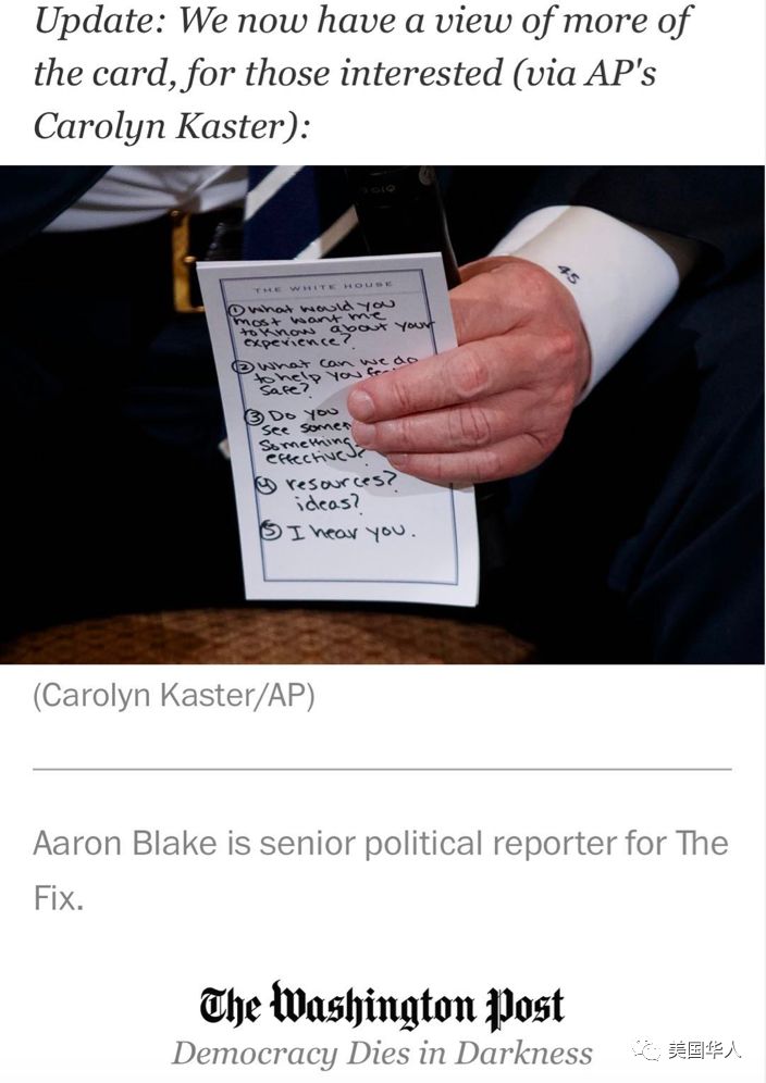 在白宫的“倾听会”上,川普总统手中拿着一个要点提示卡,上面的部分内容为:(1)你最想让我知道的有关你的经历的(指枪击案)是什么?(2)我们能做什么使你感到安全?(4)资源?主意?(5)我听见了你的声音。(第三点看不齐全,无法翻译。)
