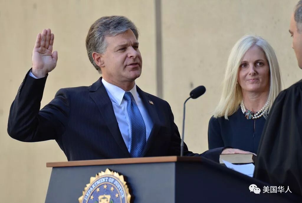 Christopher Wray的妻子Helen Wray看着他宣誓接受FBI局长职位。