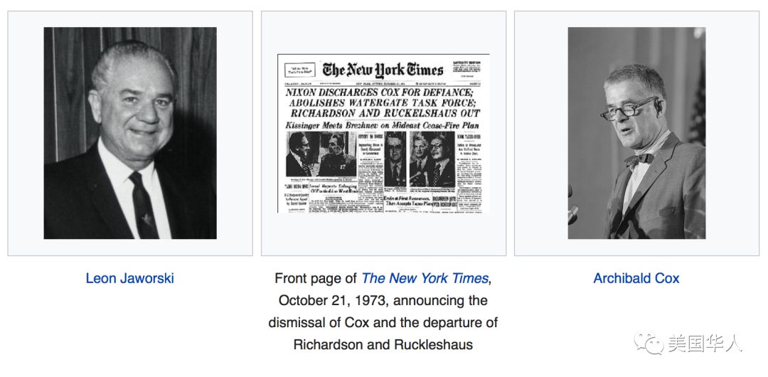 1973年10月21日,《纽约时报》头版头条报道“星期六之夜大屠杀”:尼克松总统炒掉了当时的司法部长Elliot Richardson和副司法部长William Ruckelshaus,并导致特别检察官Archibald Cox被炒。左边为被任命取代Cox的第二位特别检察官Leon Jaworski。