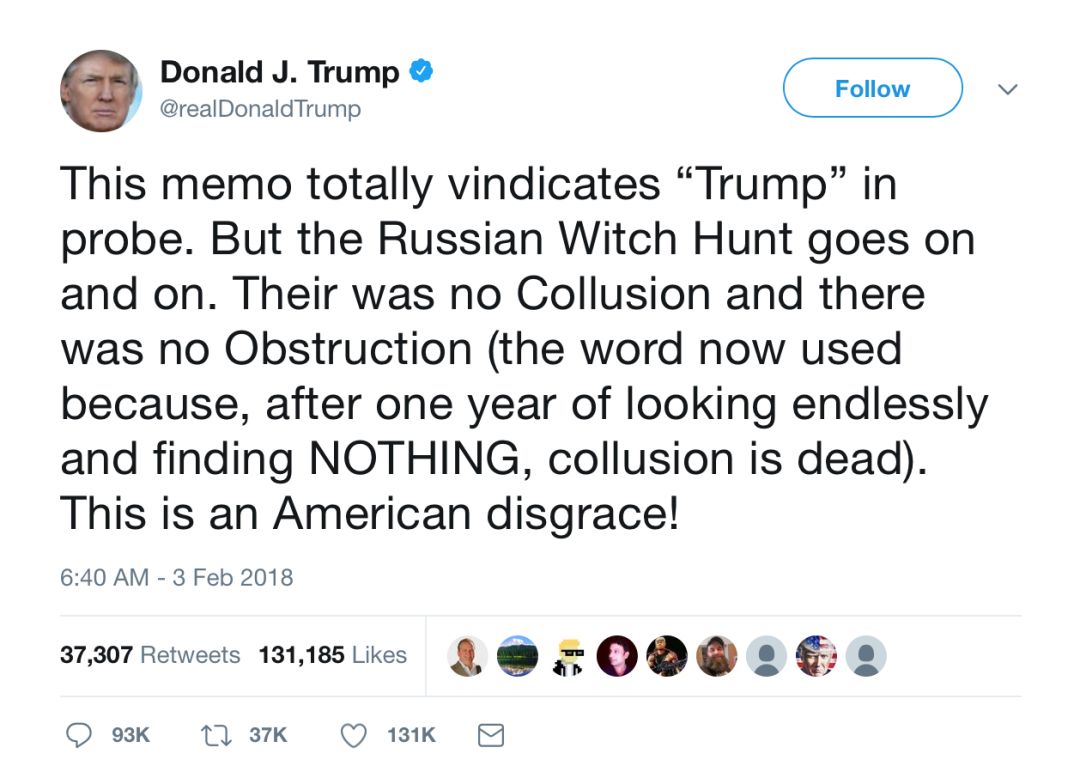 特朗普总统在Nunes备忘录公布后发推说,这个备忘录证明了“通俄门”调查是无中生有。