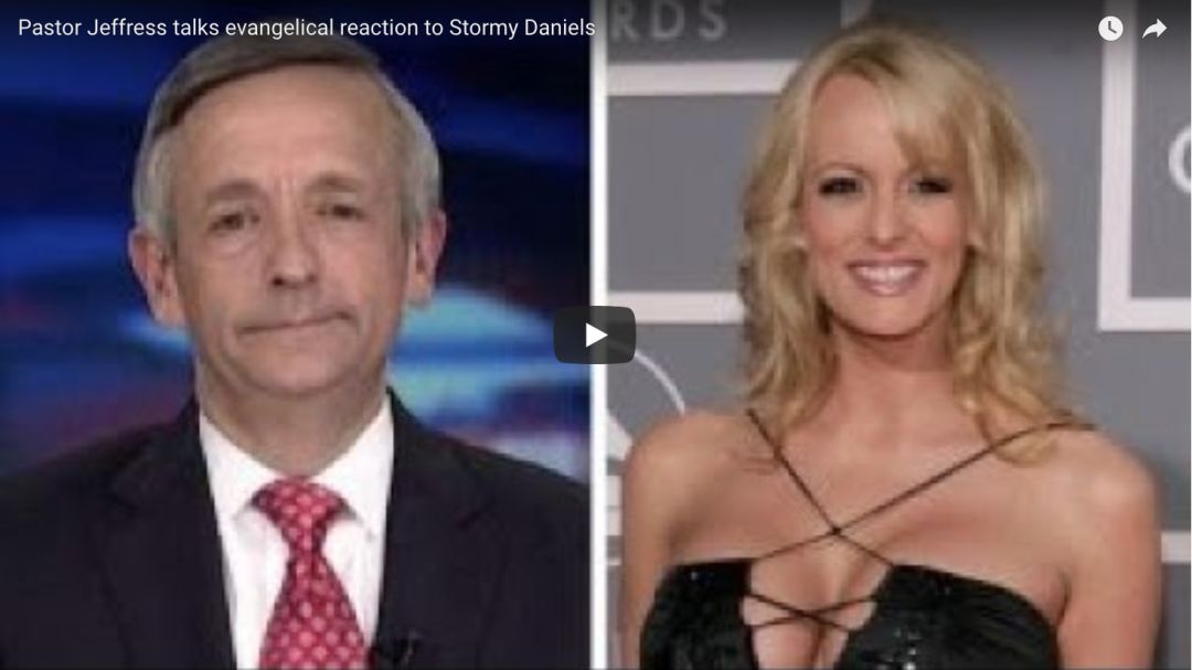 杰佛乐斯牧师接受福克斯电台访问,右边照片是色情女星Stormy Daniels。