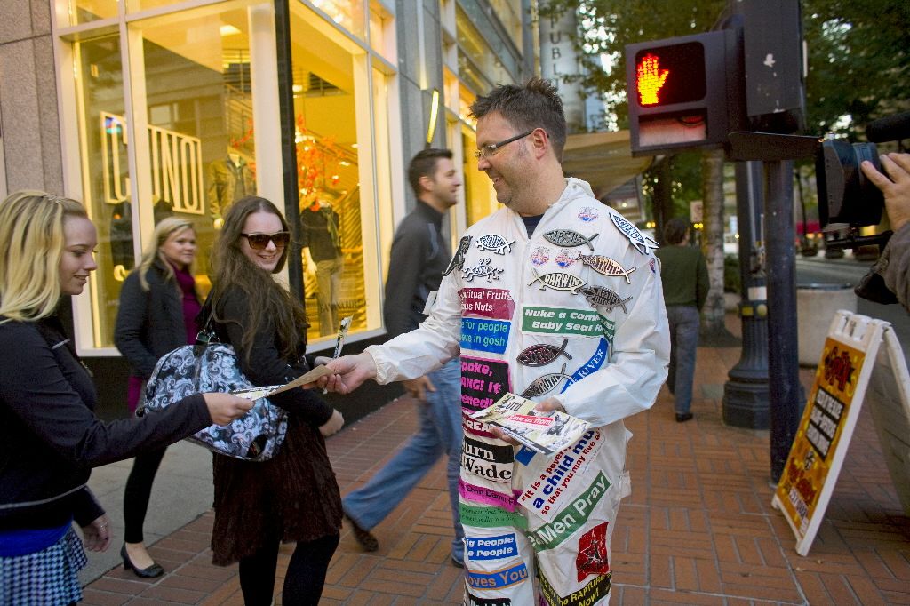 为了更多了解教外人士对基督教的看法,他到各大城市的闹区走动,身着挂满各式流行的保险杠贴纸的连身衣裤,作为谈资。这些贴纸既包括耶稣鱼,也包括达尔文爬虫。他发现,每个人都喜欢耶稣,但是不喜欢基督徒,认为基督徒是假道学、喜欢定罪他人。