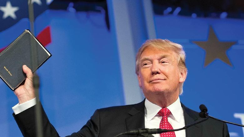 2015年在一次保守派的会议中,川普手持母亲送他的圣经,书皮有他镀金的名字。