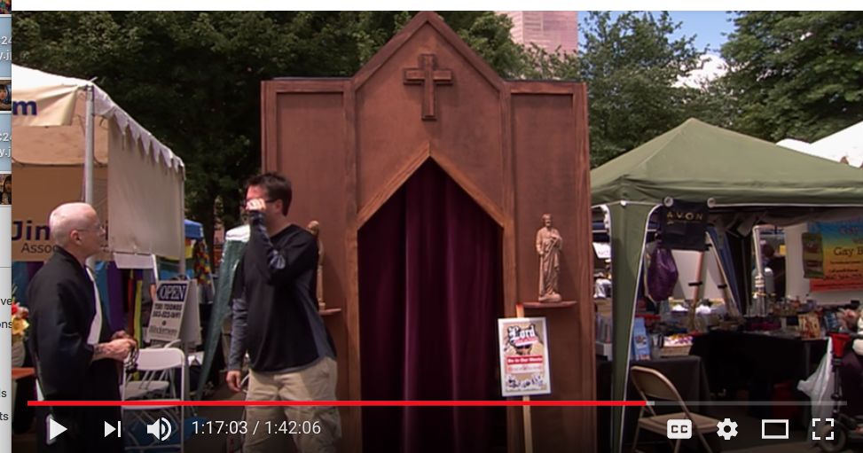 摩谦乘着波特兰市庆祝“以同性恋为荣”游行的那个周末,在闹区设立了一个“告解亭”。他邀请同性恋者到亭子里告解,但不是听对方认罪,而是他向对方认罪。很多人事先警告他,很可能会反受其辱,劝他不要这样做。
