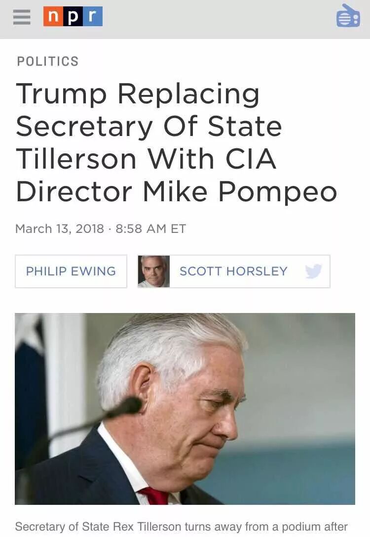 Tillerson今天清晨4点多才回家。然后早上与我们一起从川普的推特上知道自己失业了。较之于总统炒FBI局长Comey鱿鱼时给出的理由,川普今天早上在白宫草坪上说的话真实成分相当高,这个图姐一定要点个赞。不管是否同意他的政策,作为总统,川普有理由选择与自己政策理念一致的人。