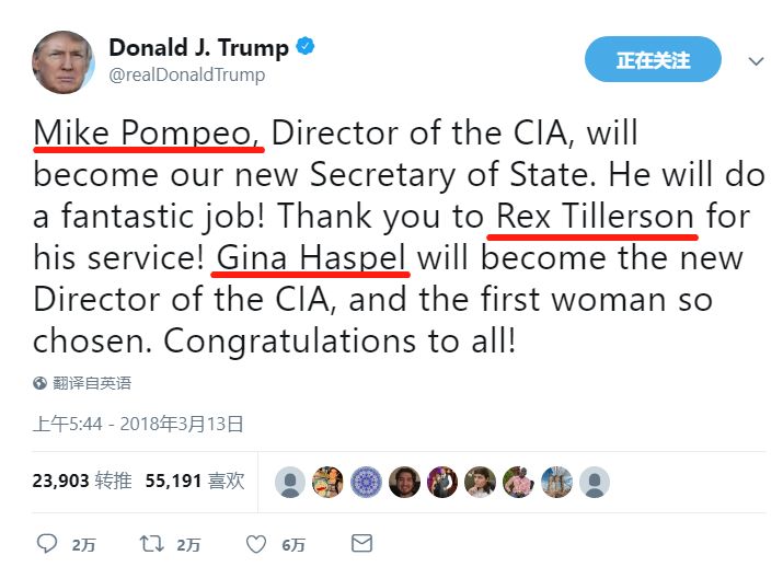 国务卿Rex Tillerson被炒鱿鱼,CIA(中央情报局)局长Mike Pompeo被任命接任该职。与此同时,Gina Haspel被任命为美国历史上第一位女性CIA局长。不过,这位还没有通过国会听证和相关背景安全调查。图姐友情提醒,在川总治国的时间框内,请保持对任何政要都可能随时领盒饭被洗刷刷出局的基本警惕感。换句话说,先别提前庆祝第一位女性中情局局长的产生。