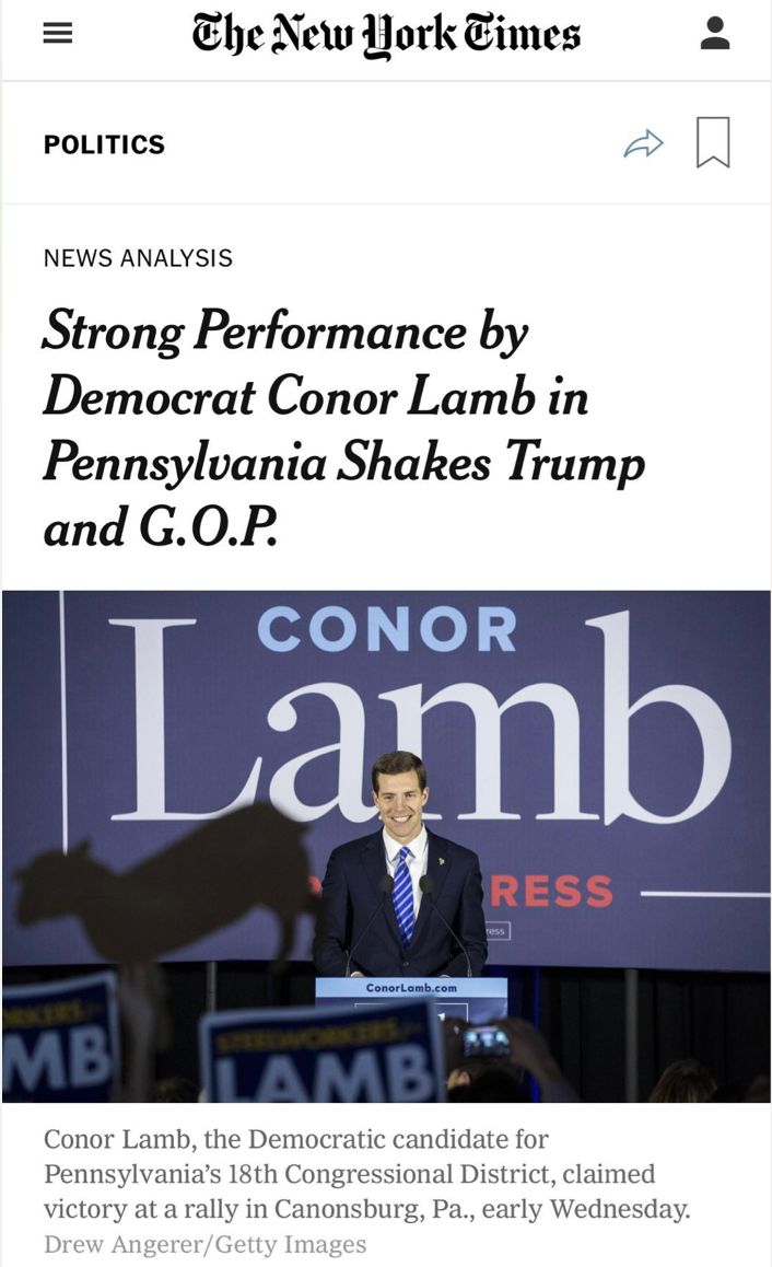 特朗普在为Saccone助选时借Lamb的名字嘲弄他即便当选了也无非是个乖乖的羔羊。但就是这个“羔羊”,敢于在深红选区挑战共和党候选人,勇气堪比初生牛犊。Lamb,Way to go!