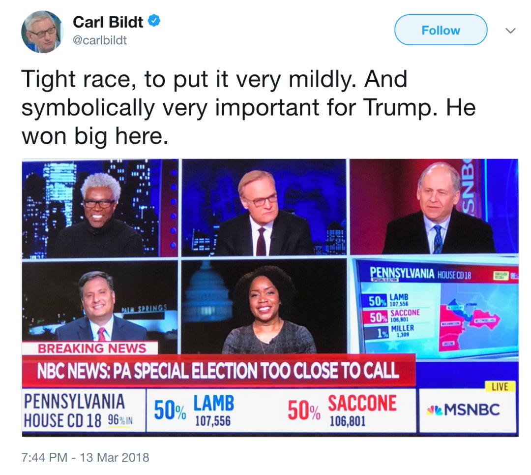 3月13日(周二)是宾夕法尼亚州第18国会选区联邦众议员特别选举日。选举结果是49.8%比49.6%,民主党的Conor Lamb在所有“缺席选票”都计入之后以627票之差胜选。