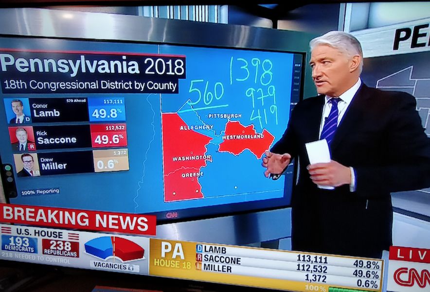 CNN民调专家兼节目主持人John King在分析不同区域的选情,Lamb胜选的关键是Allegheny郡,人口密集的匹兹堡以南的城郊地区。