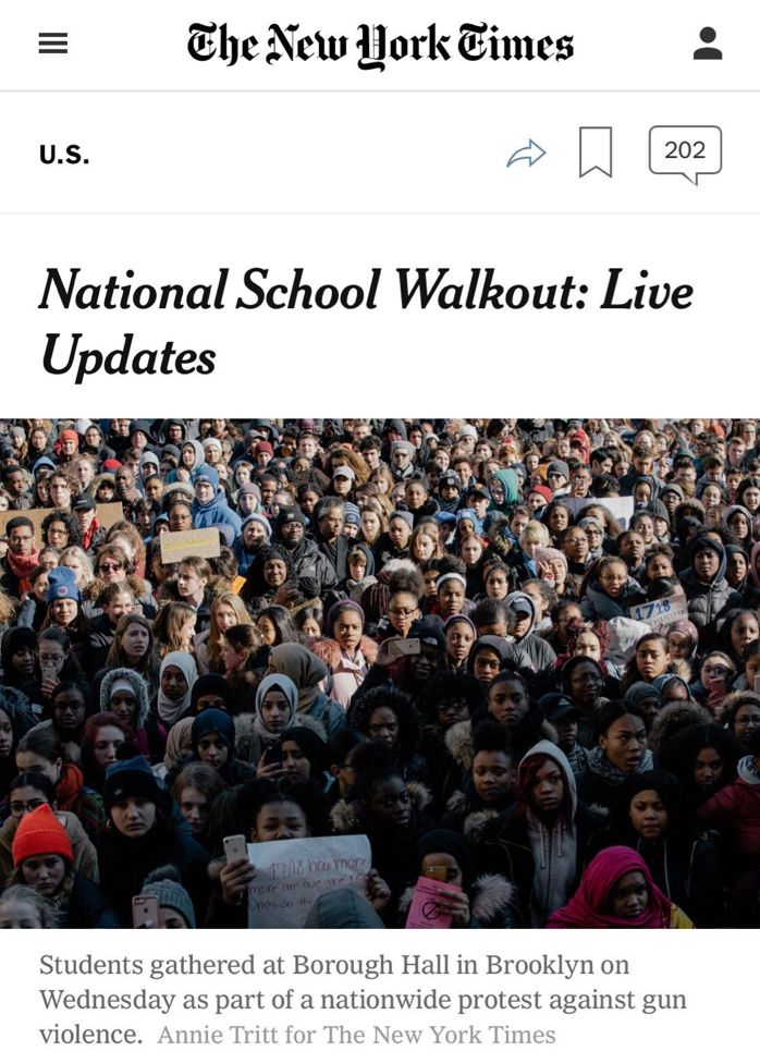 今天(3月14日),美国全国各地数以千计的中学生走出教室,参与了17分钟的“罢课”,呼吁控枪。