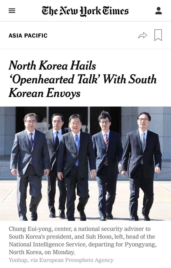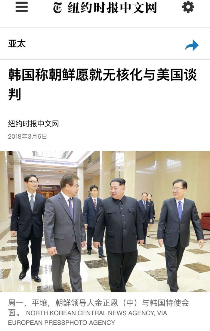 《纽约时报》报道韩国国家安全总监钟瑞勇领队的10人代表团去平壤。