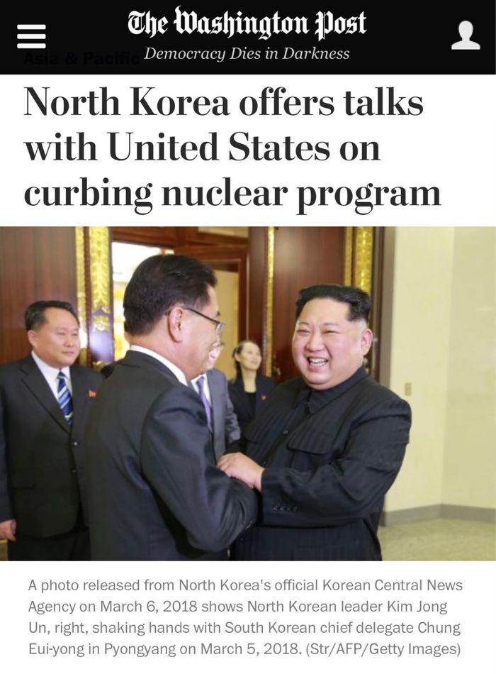3月6日,周二,韩国总统国家安全总监钟瑞勇在首尔表示,朝鲜领导人金正恩告诉南韩特使,他的国家愿意与美国就放弃核武器展开谈判,并表示将在进行此类谈判时暂停所有核试验和导弹试验,如果美国可以保证朝鲜的国际安全。