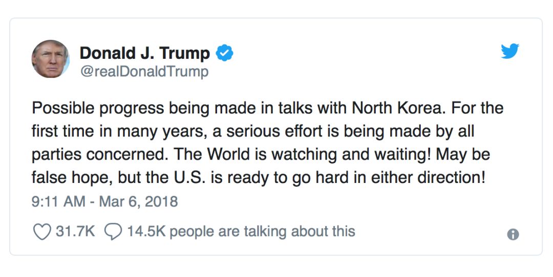 特朗普总统则发了一个言辞谨慎的推文对朝鲜态度的改变表示欢迎:“与朝鲜的对话可能取得了进展。多年来这是第一次参与谈判的每一方都严肃认真地对待了。世界正在观望和等待!也许只是虚假的希望,但无论往那个方向走,美国都做好了充足的准备!”