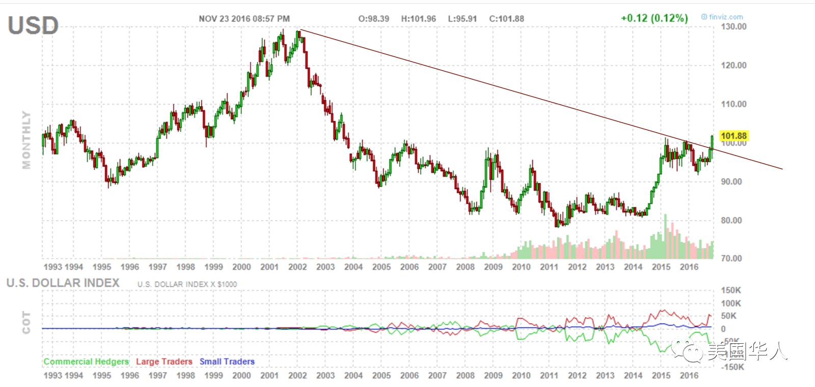 显然,这个趋势在川普胜选后被打破了。它的长期意义是什么呢?是不是意味着市场预期美国贸易逆差不断增长的趋势嘎然而止?美元将从世界各地回流到美国?近期来看,美元指数还有不小的上升空间。这对美国的出口不利、进口有利。但美元回流美国,对经济应该是好事。正负相抵,结果是正还是负呢?