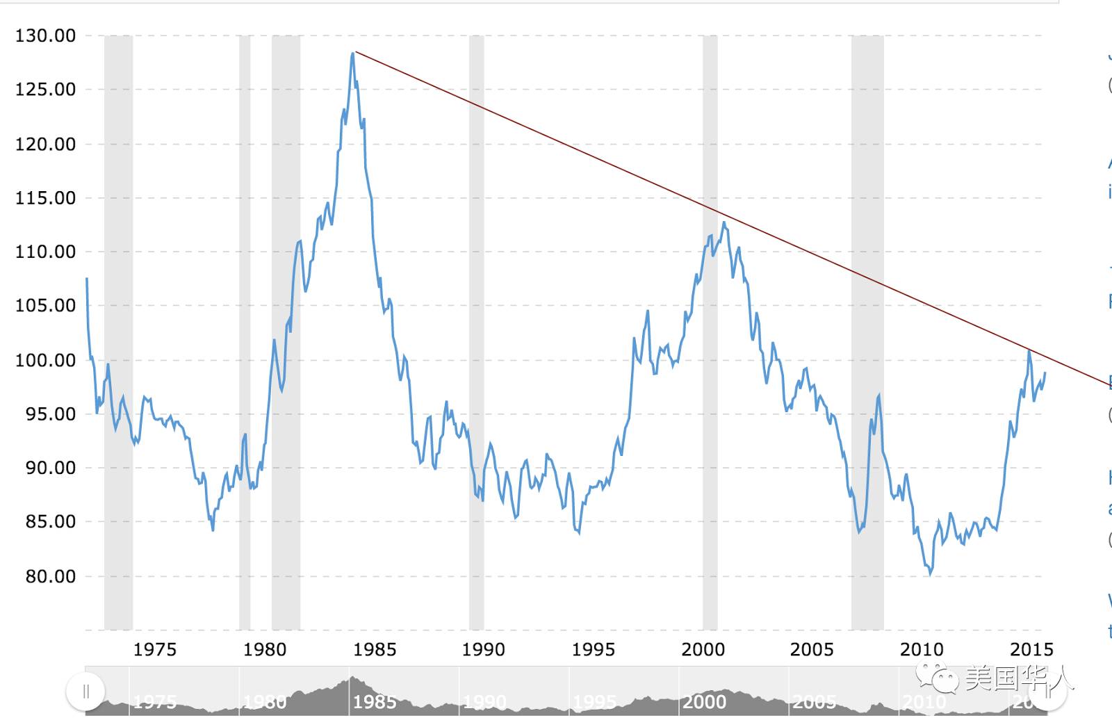 然而,最具革命性的发展是美元指数重新向上突破100,完成历史性的转变。我以下面两张图来直观地展现这个30年之大变局。第一张图中向下的红线勾勒出自1984年以来美元不断走低的趋势,第二张图中的红线是前图中趋势的延伸。
