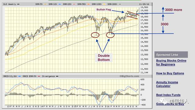 从图表的技术分析上看,道指在选前三个月虽然小幅下坡,其实是牛市中的“旗子”巩固形状(Flag Formation),蓄势待发。我在选前已经注意到,预期选后道指会涨,以为那是希拉里将赢的信号。但不成想川普赢了,道指一样大涨。看来道指早已拿定主意,无论谁赢它都会涨。它涨后,我们来提出各种基本面的原因都是事后诸葛亮,没有实际意义。再看大图,四年周线图上有个明显的“双底”向上突破的牛市形状,预期道指还能再涨2500点,2017年达到21500左右。再往远看,技术分析就不够了,需要作基本面上的揣测。见下图: