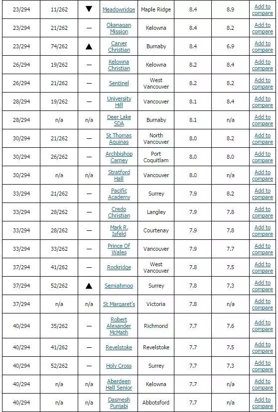温哥华的St George's排名第4位,西温的Collingwood则排在第5位,素里两间学校Southridge和Relevant也表现不俗,分别位列第6和第7名。