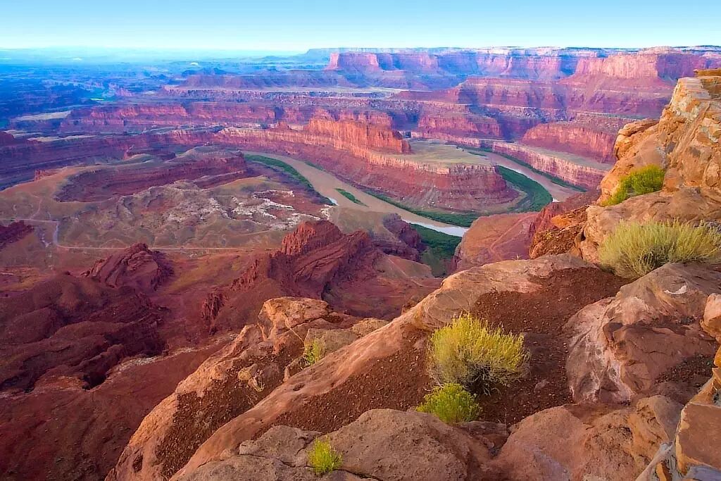 站在死马点,俯瞰前方,收入眼帘的正是整个公园最让人流连忘返的景致——红白交错高低起伏的砂岩被科罗拉多河深深切入,形成了一个似曾相识却又独一无二的“鹅颈湾”。春夏两季的河湾两侧绿意盎然,配上科罗拉多高原上经典的红石,那一定是天神打翻了调色板。冬天前往公园,如有幸遇上大雪,也定能体验一种别样的意境。
