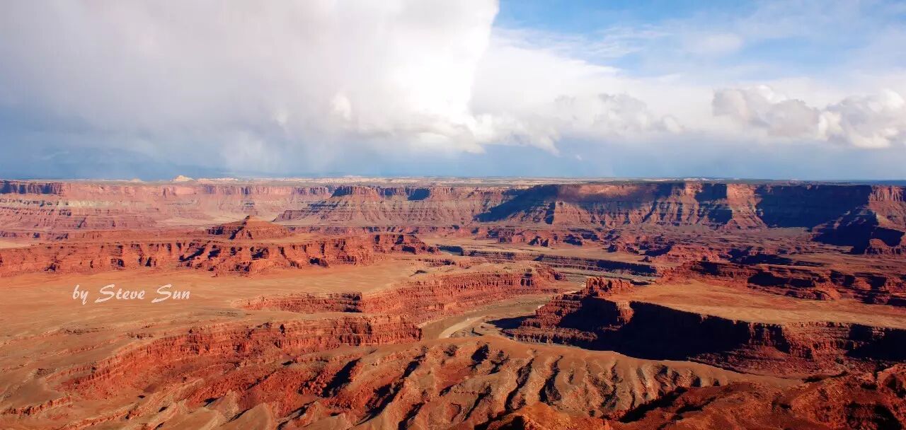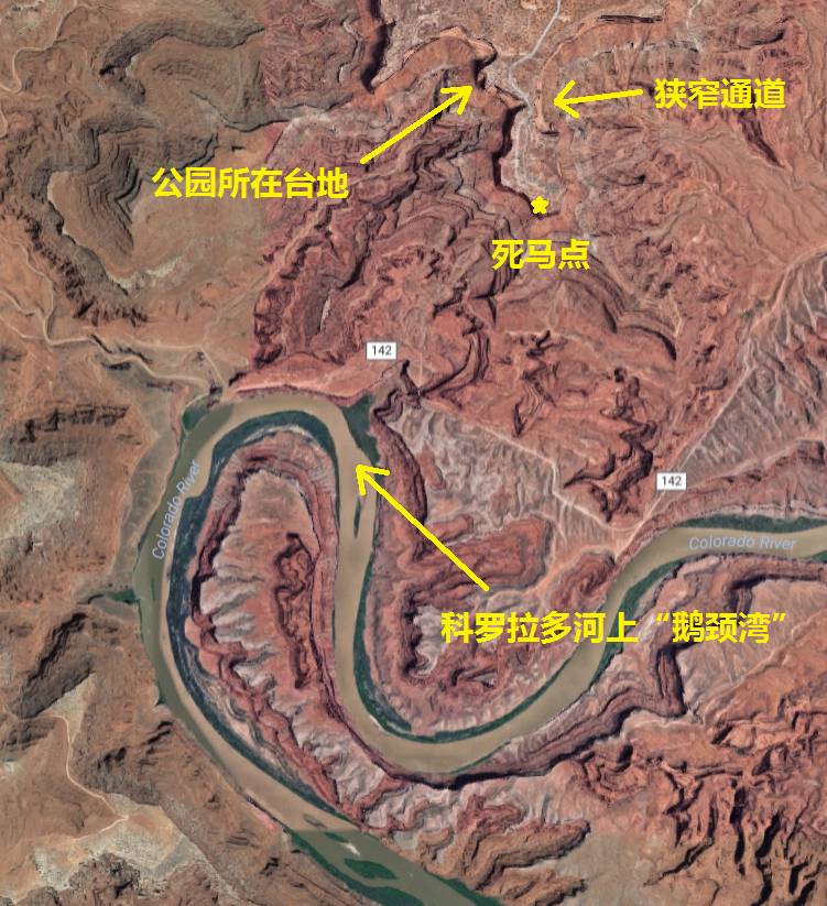 摩押的远近闻名显然不能只靠拱门公园,另一个稍稍让人觉得陌生的名字——峡谷地国家公园(Canyonlands National Park)——也为此做出了卓越贡献。虽然峡谷地的风景在小猴心中甩了拱门好几条街,小猴也急切的想把这里的神奇分享给大家,但它仍然不是我们今天的主角。真正的主角,咳咳,在峡谷地门口的岔路上——死马点州立公园(Dead Horse Point State Park)。