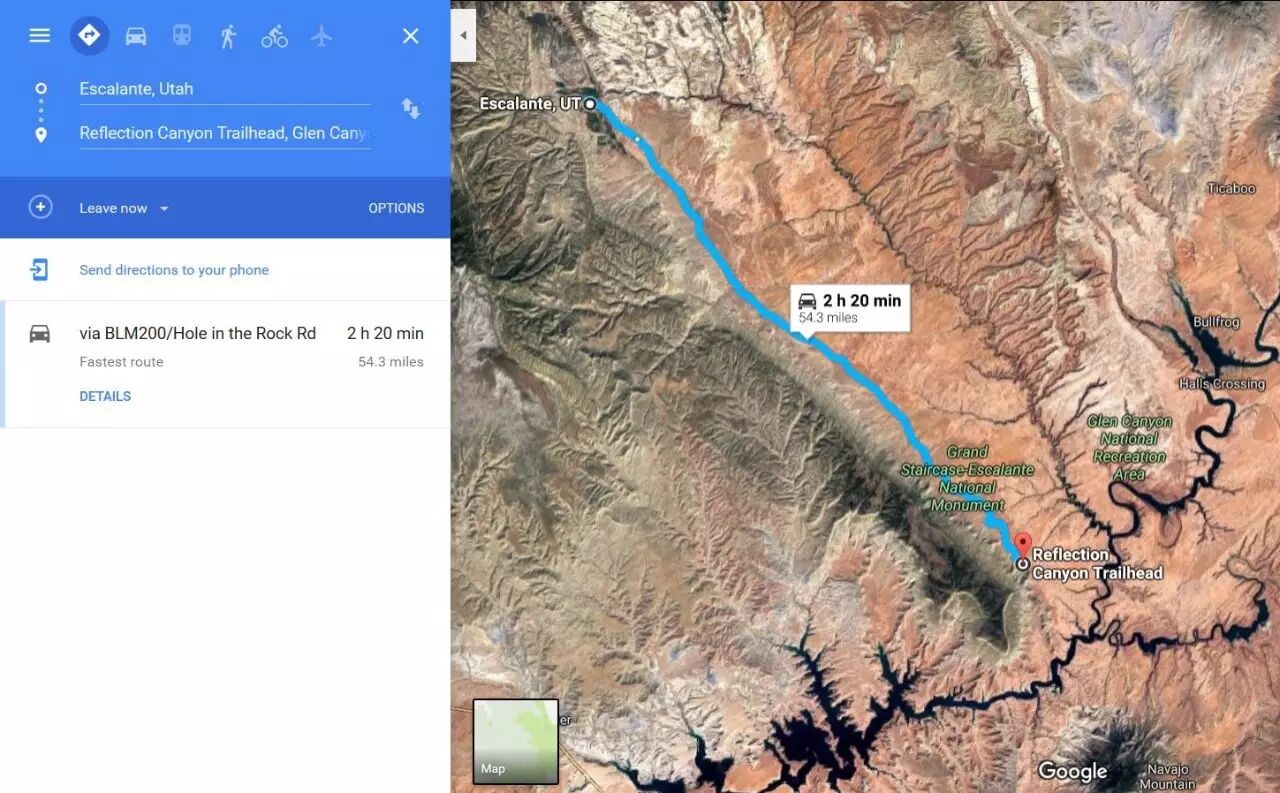 Google地图:从埃斯卡兰特到步道起点差不多90公里的土路