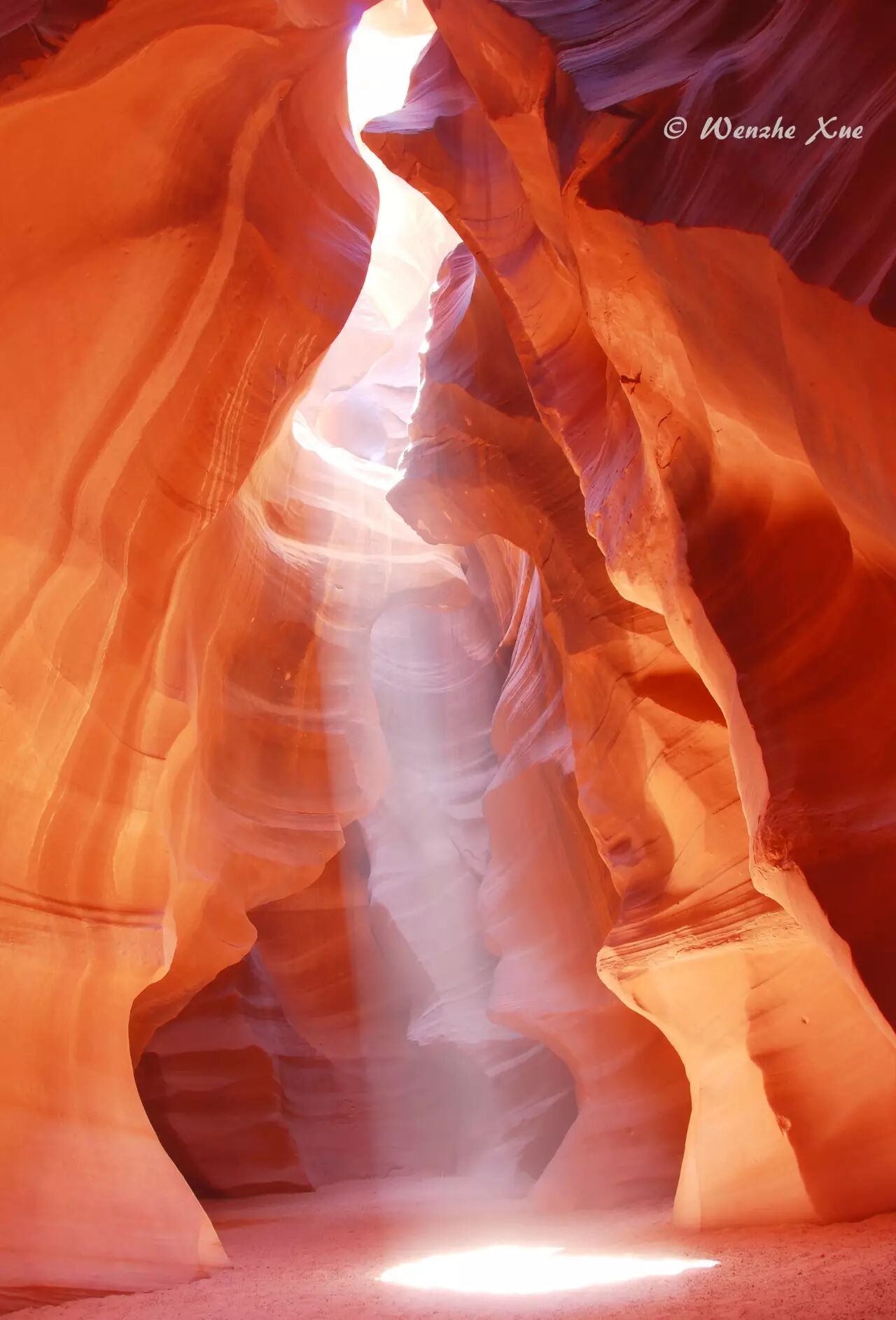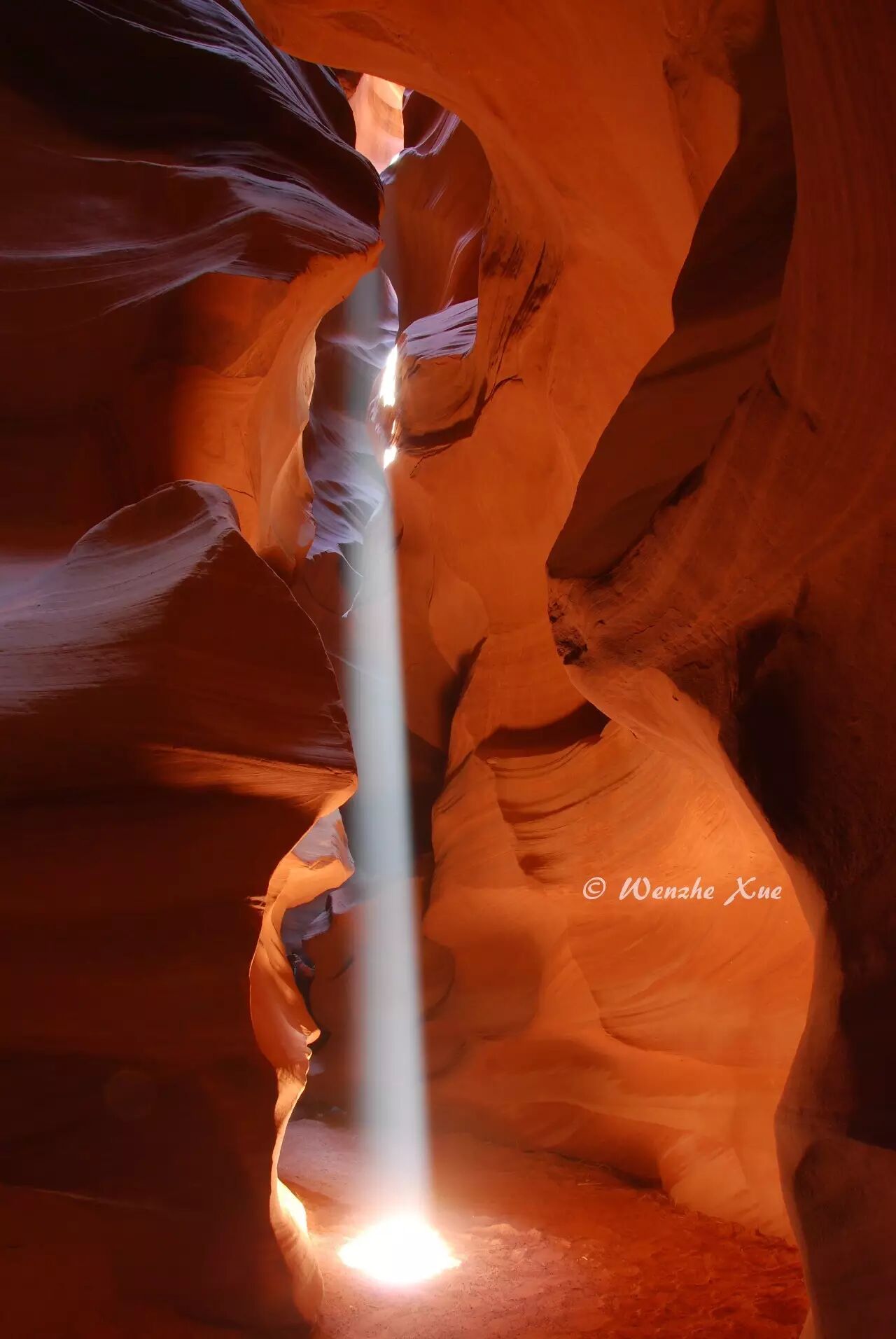 由于上羚羊谷的构造上窄下宽,所以正午前后阳光透过顶部狭缝某特定位置会形成光柱。但是,还需要给这个“正午前后”加上个条件——四月到九月,只有当太阳足够高的时候才会出现直射到地面的光柱。