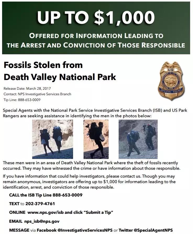 公园总监麦克·雷诺兹表示,从国家公园收集化石、岩石或者其他任何东西都是非法的。公园管理局已拿出1000美元用以征集盗窃者相关线索。