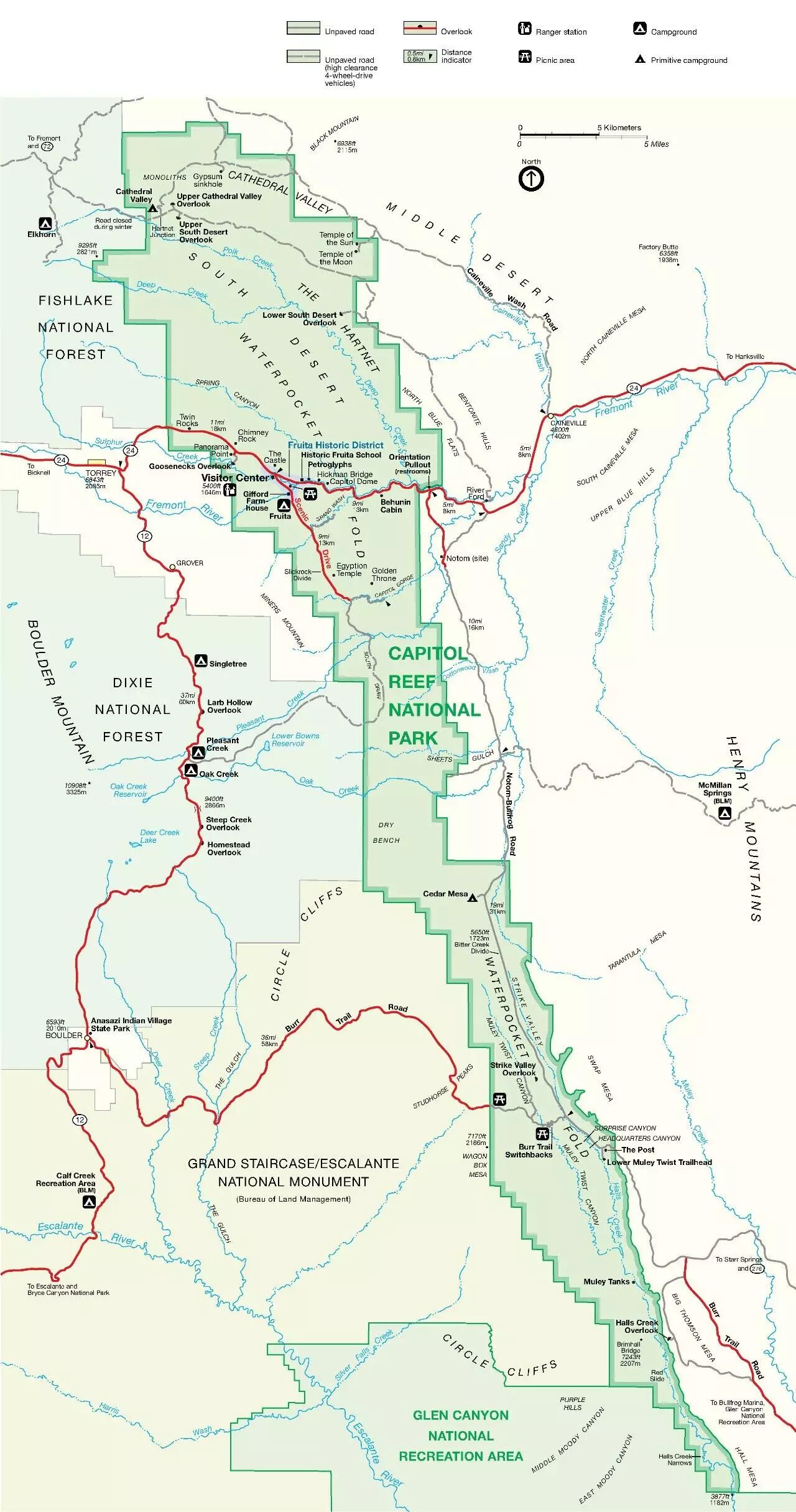 这里最重要的景点是Strike Valley Overlook,看waterpocket fold,想去那里有多条路线供选择。从北边可以在公园东侧的24号公路向南转上Notom-Bullfrog Road前往,从东南的Bullfrog过来则须走Burr Trail Road。前者要经历30英里(近50公里)土路颠簸,所以小猴相当不建议;后者的起点太过偏僻,估计很少有人会从那里出发,小伙伴们也可以自行忽略。