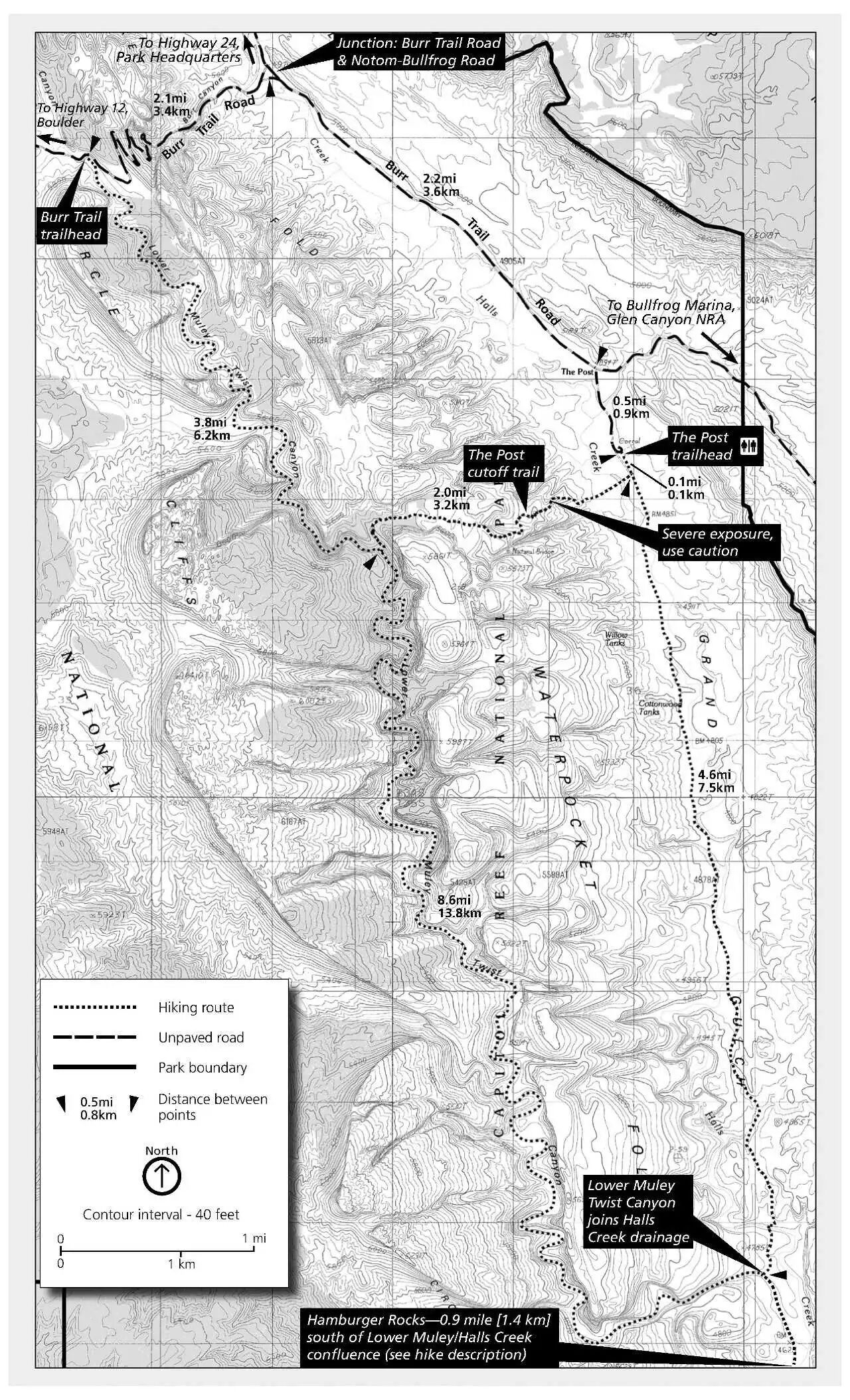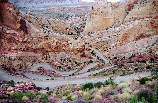 最后这第三条路线自然也就是小猴要推荐的。从著名景观公路犹他12号公路(UT-12)上的小镇Boulder向东沿Burr Trail Road开36英里(约56公里)——这一段大部分是铺设好的公路,开着没那么折腾——你会经过一段之字形盘山路(Burr Trail Switchbacks),这里本身也算是一处景点吧。