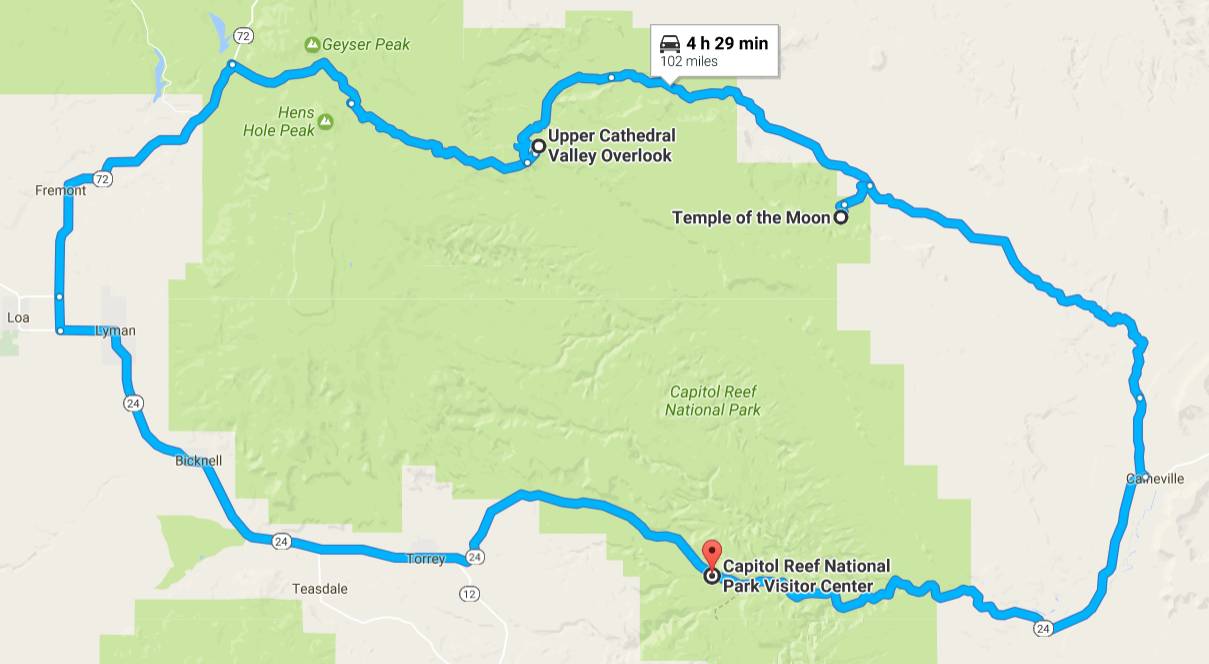 公园最北端被称为Cathedral Valley,此区域有两个重要景点,一是太阳神庙(Temple of the Sun)和月亮神庙(Temple of the Moon),二是大教堂谷观景台(Upper Cathedral Valley Overlook)。