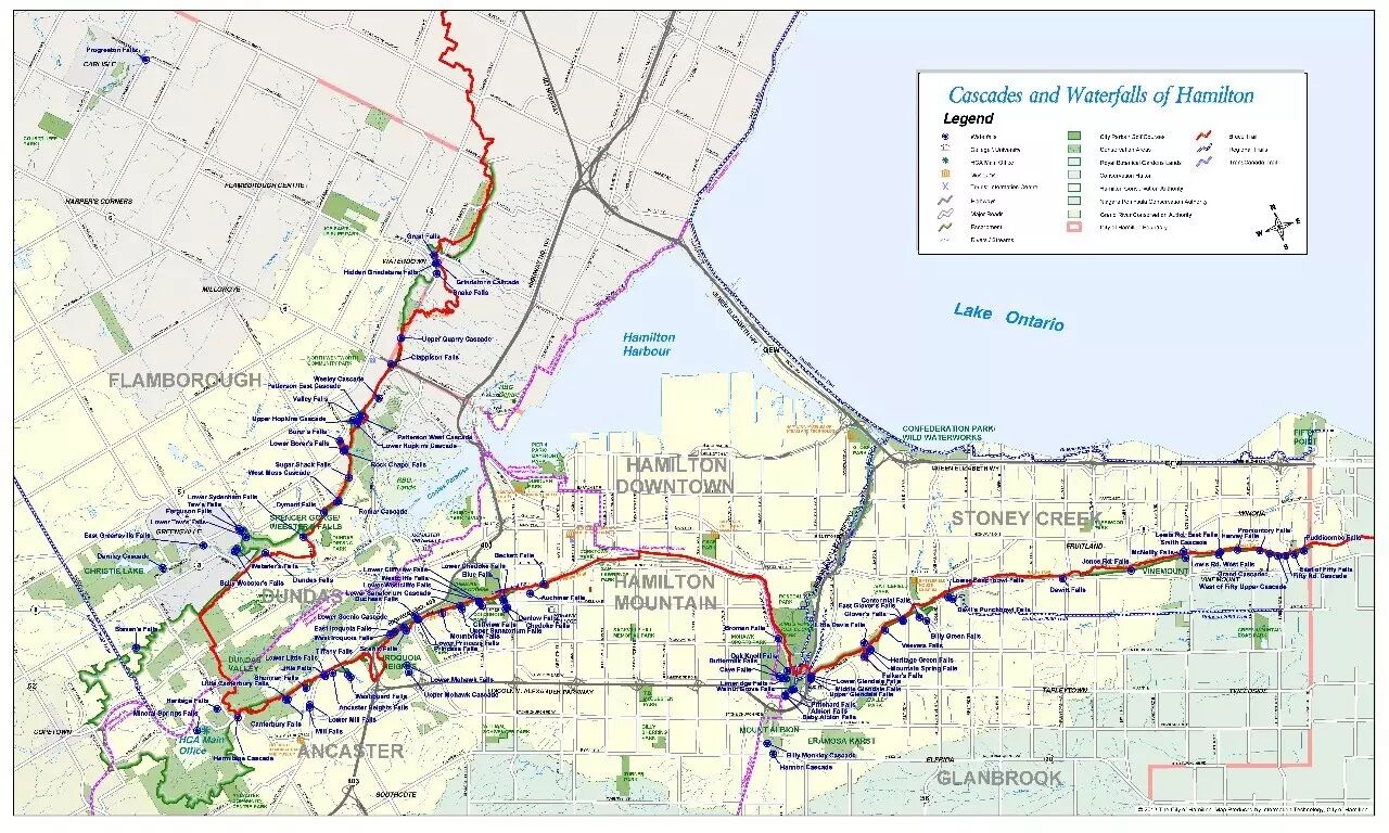看看上面这张汉密尔顿地区的瀑布分布图,蓝点代表瀑布,总数真的超过了一百道... 而这些瀑布也确实都分布在陡崖上(绿线)。那红线又是什么东东?这是一条步道——布鲁斯步道(Bruce Trail)。你抽空把穿过汉密尔顿的布鲁斯步道走一遭,这高矮胖瘦的各色瀑布也就能饱览遍了。