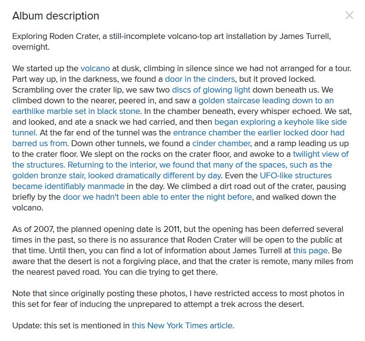 1977年的时候,一位名叫James Turrell的艺术家来到了亚利桑那州旗杆镇东北的彩绘沙漠(Painted Desert)地区,大手一挥买下了一块地。和这块地一起被卖掉的,还有一座静静矗立在那里、有着40万年历史的死火山——罗登火山口。
