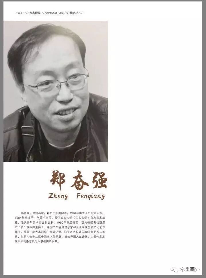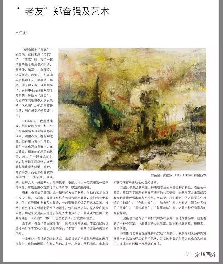 1995年11月号的《同舟共进》封三“海外华人画家”专栏刊出郑奋强的油画作品《山村印象》,同时发表我写的点评:“近日,笔者收到他从遥远的西欧寄来的几幅作品照片,从中我们可以看出画家努力在中西文化双向交互中寻找自己的方位。《山村印象》深沉厚朴,具有浓郁的东方装饰韵味。作者着重的是整体结构与气势的把握,几组经过选择、提炼的色彩组合,加之流畅而遒劲的笔触,传递诱人的光色效果,抒发了异国山庄静谧而自得的乡土情调,给人留下难忘的视觉形象。”奋强在未移居德国之前,他的作品多为表现乡土的题材,作品富有生活气息和诗意,弥漫着孤寂感和丝丝的乡愁。他对水彩画艺术本体语言有很好的把握。作品在表现对生活感受的同时,也反映前辈画家、特别是美国著名画家怀斯艺术的精髓,透过他自己的作品的消化、综合而转化为自己的美学形态。