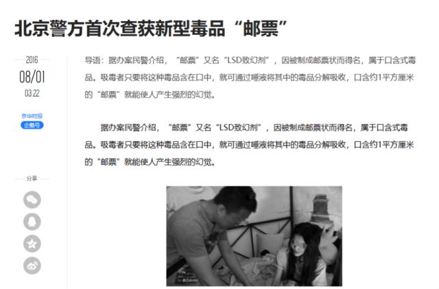 这种毒品近些年在中国出现过,其特点是非常好隐蔽,甚至能被制成“邮票”瞒天过海,而吸毒者只要将这种“邮票”含在嘴里,就能将其中的毒品分解吸收了(如下图报道中所示),是我国执法部门的重点打击对象。