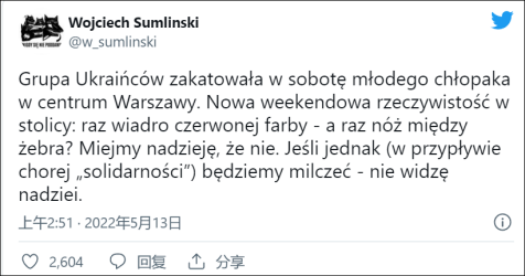 波兰一名调查记者愤怒发推:“一群乌克兰人在华沙市中心折磨一名小男孩。这就是首都周末的现实:一次是一桶红油漆(一群亲乌克兰的示威者朝俄罗斯驻波兰大使脸上泼红色染料),一次是肋骨间的刀?如果(在病态的‘团结’中)我们保持沉默,我看不到希望。”