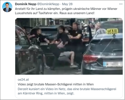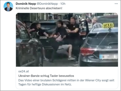 开豪车、住豪宅、不守规矩、随意打人,这么一通看下来,这哪里像是逃难的难民啊,分明就是嚣张跋扈的恶霸公子哥!这直接点燃了当地人的愤怒,维也纳市议员多米尼克·内普更是怒发2条推文讽刺和怒斥这帮人:“乌克兰男子非但没有为祖国战斗,却在维也纳的豪华酒店外殴打出租车司机。滚出我们的国家!”“驱逐罪犯逃兵!”