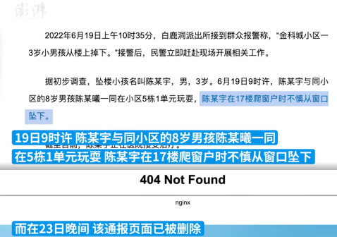 大家好,我是窈窕妈妈。前几天,湖南郴州,通报了一起3岁男童小宇坠楼的新闻。 最初的通告,写的是小宇和同小区8岁男孩陈某曦一同玩耍,在攀爬17楼窗户时不慎坠下。 没几天,迎来反转。图源@澎湃新闻