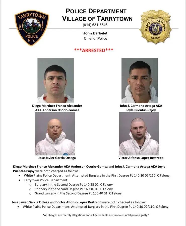 警方称他们的调查表明,这四名来自皇后区的嫌疑人曾多次在威郡的塔里镇 Tarrytown和白原 White Plains 作案,也涉嫌与此前皇后区的一系列入室盗窃案有关。